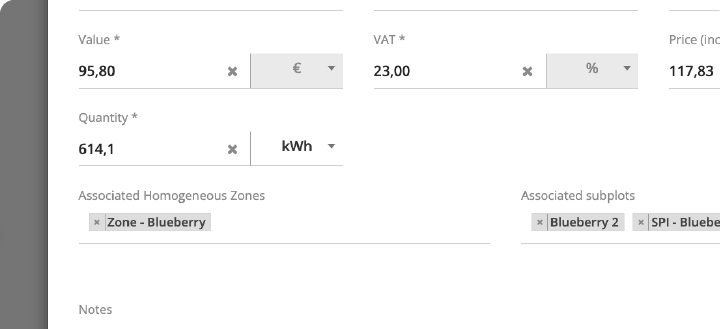 In the Costs section, the quantity unit field now includes kWh as an option. This allows you to track costs and energy quantities directly on the platform, ideal for monitoring your farm's energy consumption.