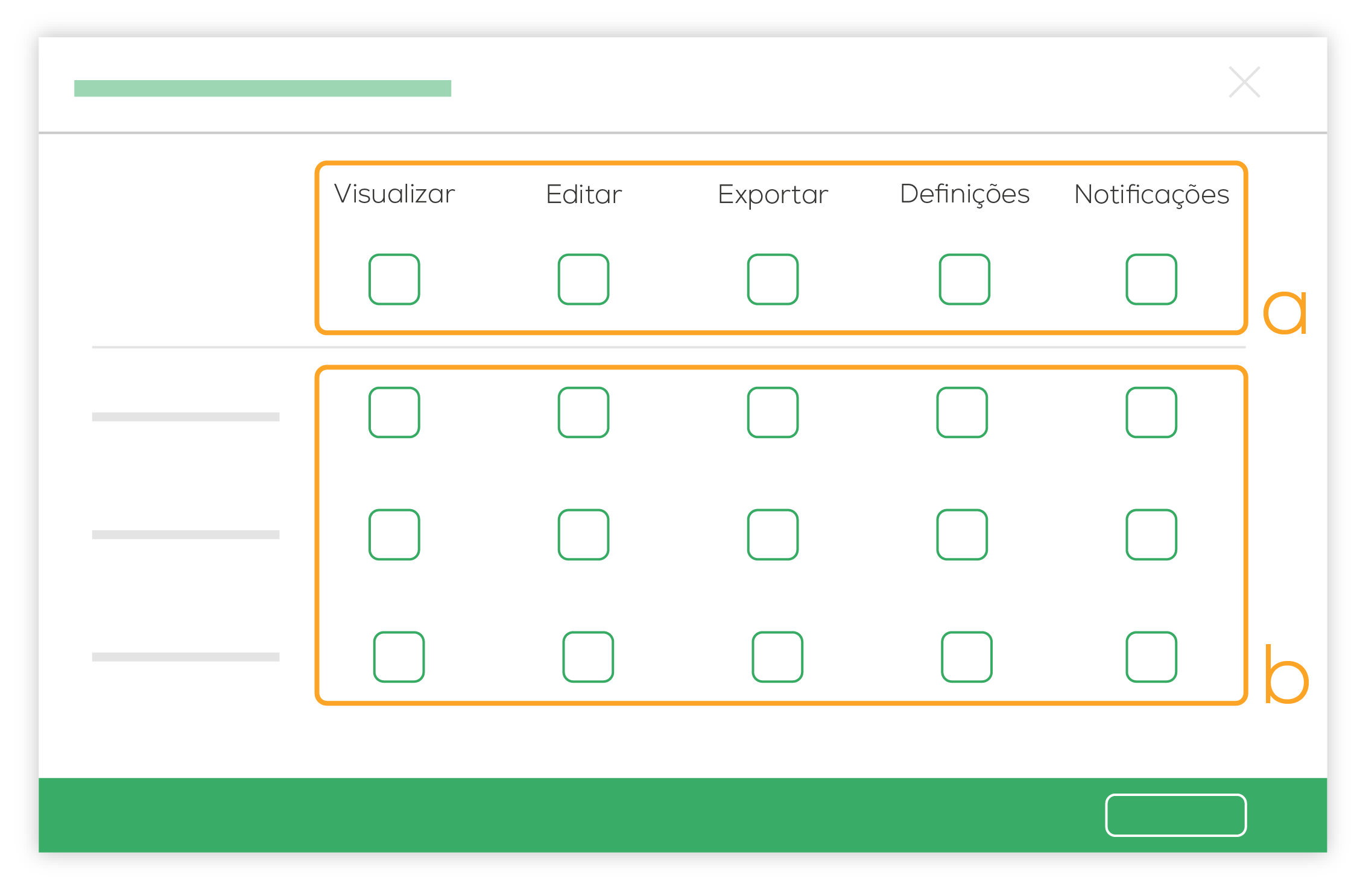 - Na linha superior da tabela, pode aplicar rapidamente um mesmo tipo de acesso a todas as Aplicações e Complementos. Por exemplo, se clicar no quadrado abaixo de “Editar”, o utilizador passará a ter permissão de edição em todas as áreas da plataforma.
