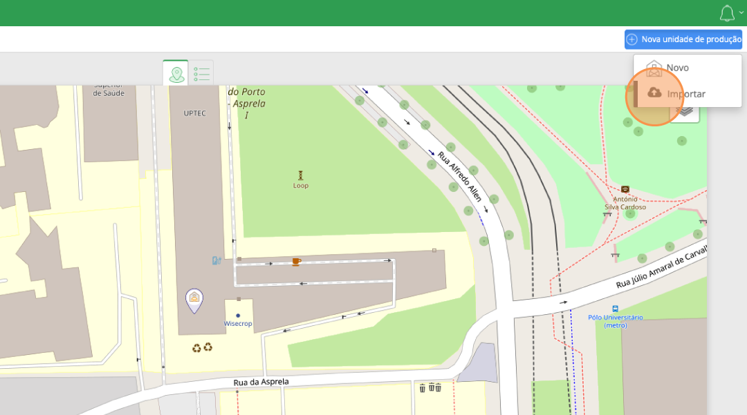 Clique no botão azul "Nova unidade de produção" e escolha a opção Importar.