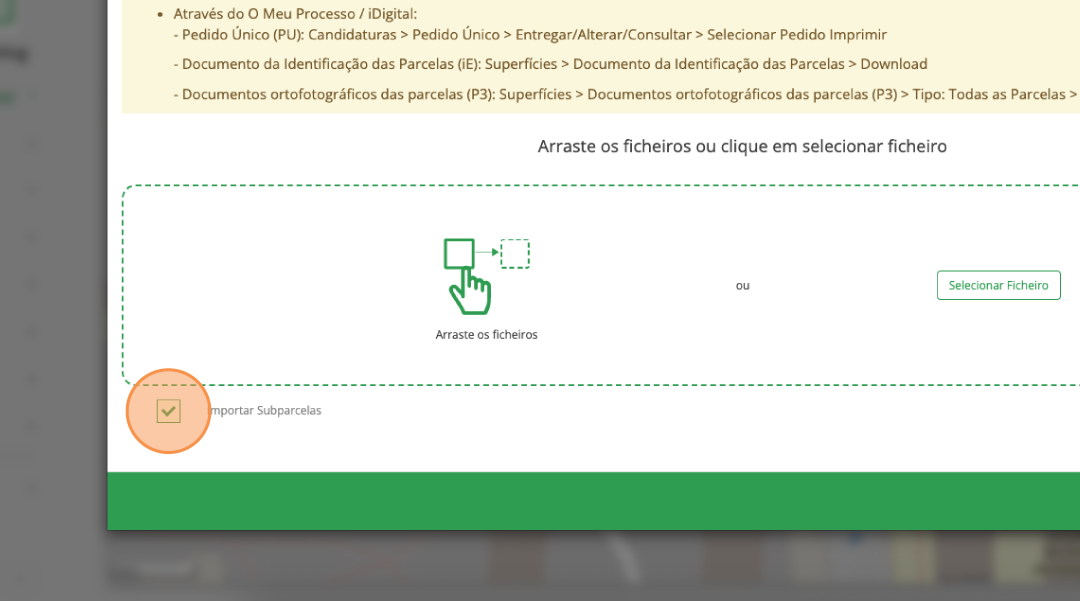 - Marque a opção Importar Subparcelas para importar as culturas instaladas em cada parcela.